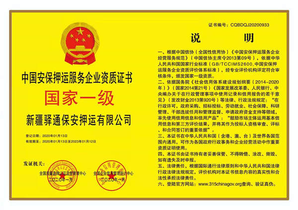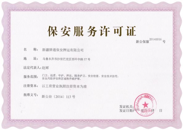 新疆驛通保安押運有限公司,注冊資本1000萬元人民幣,具有獨立法人資格,下設部門有:綜合管理辦公室、人力資源部、指揮中心、保衛(wèi)部、財務部、業(yè)務部、押運部、督察隊、公司金庫。公司建立了符合市場和現(xiàn)代企業(yè)要求的經營運作模式和管理機制,有一套較科學的經營管理制度、守押勤務制度、守押作業(yè)規(guī)范化操作制度和標準。